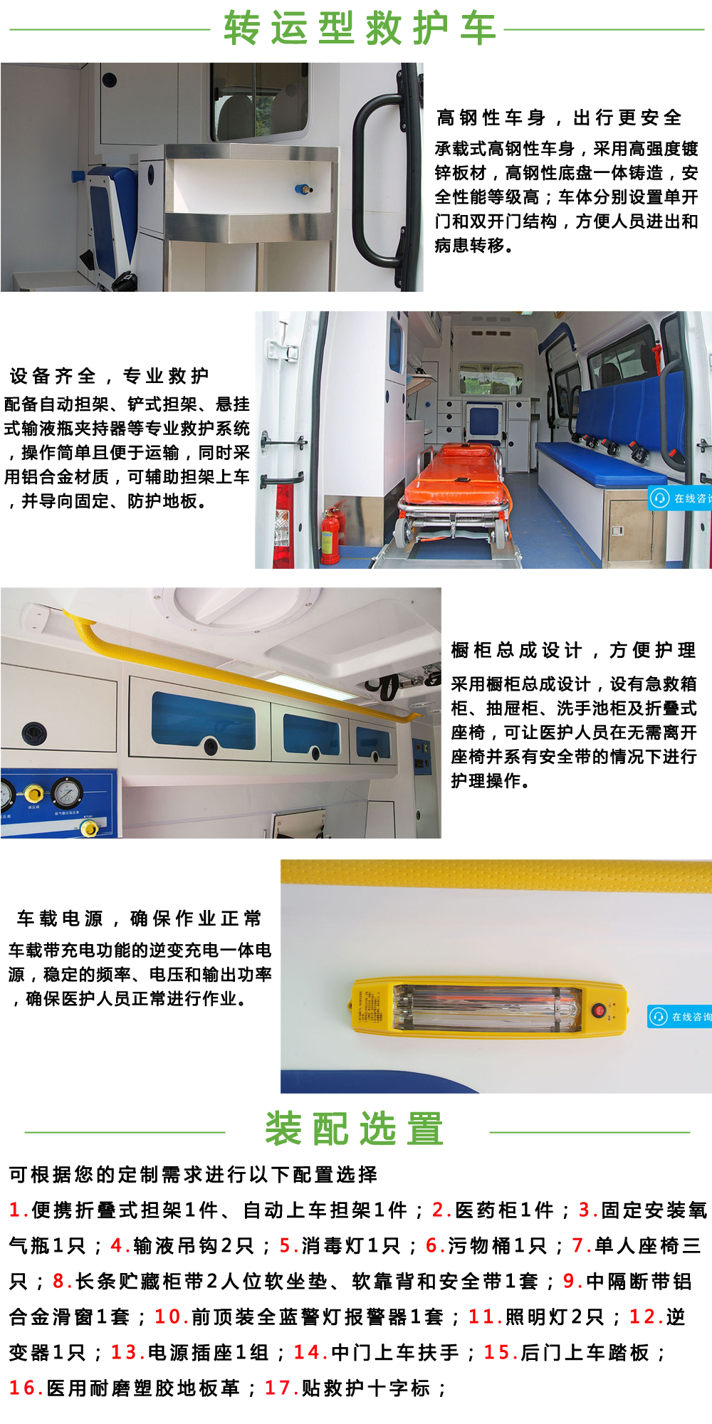 該車配備醫(yī)療器械柜,氧氣瓶,擔架,消毒燈,特種車輛標志燈及**報器等專用裝置.選裝車頂前額位置特種車輛標志燈時高度分別為2580mm,2590mm,2685mm.ABS系統(tǒng)**器型號:6C11 2M110 A*;ABS系統(tǒng)**器生產(chǎn)企業(yè):博世汽車部件(蘇州)有限公司;發(fā)動機**大凈功率99kw. | |||