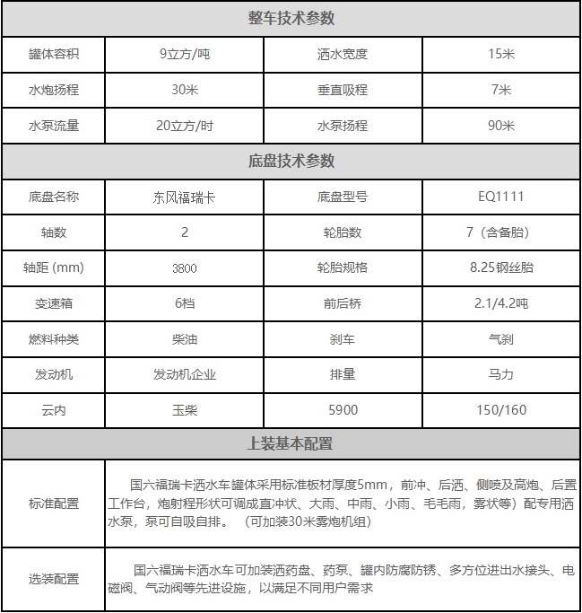灑水車又稱為噴灑車、多功能灑水車、園林綠化灑水車、水罐車、運水車。 灑水車適合于各種路面沖洗,樹木、綠化帶、草坪綠化,道路、廠礦企業(yè)施工建設(shè),高空建筑沖洗。具有灑水、壓塵、高、低位噴灑,農(nóng)藥噴灑、護(hù)欄沖洗等功能,還具有運水、排水,應(yīng)急等功能。