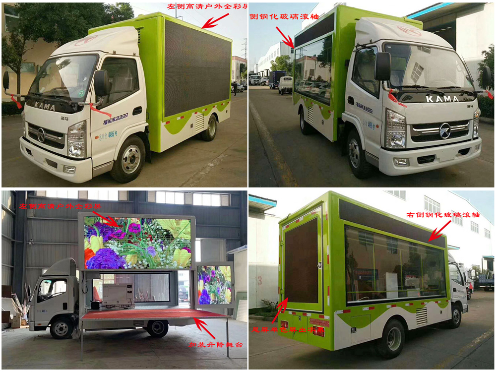 廣告車(chē)選裝配置:客戶可根據(jù)需求選裝屏幕清晰度(P10彩屏、P8彩屏、P6彩屏、P5彩屏、P4彩屏)、單面彩屏、雙面彩屏、雙面